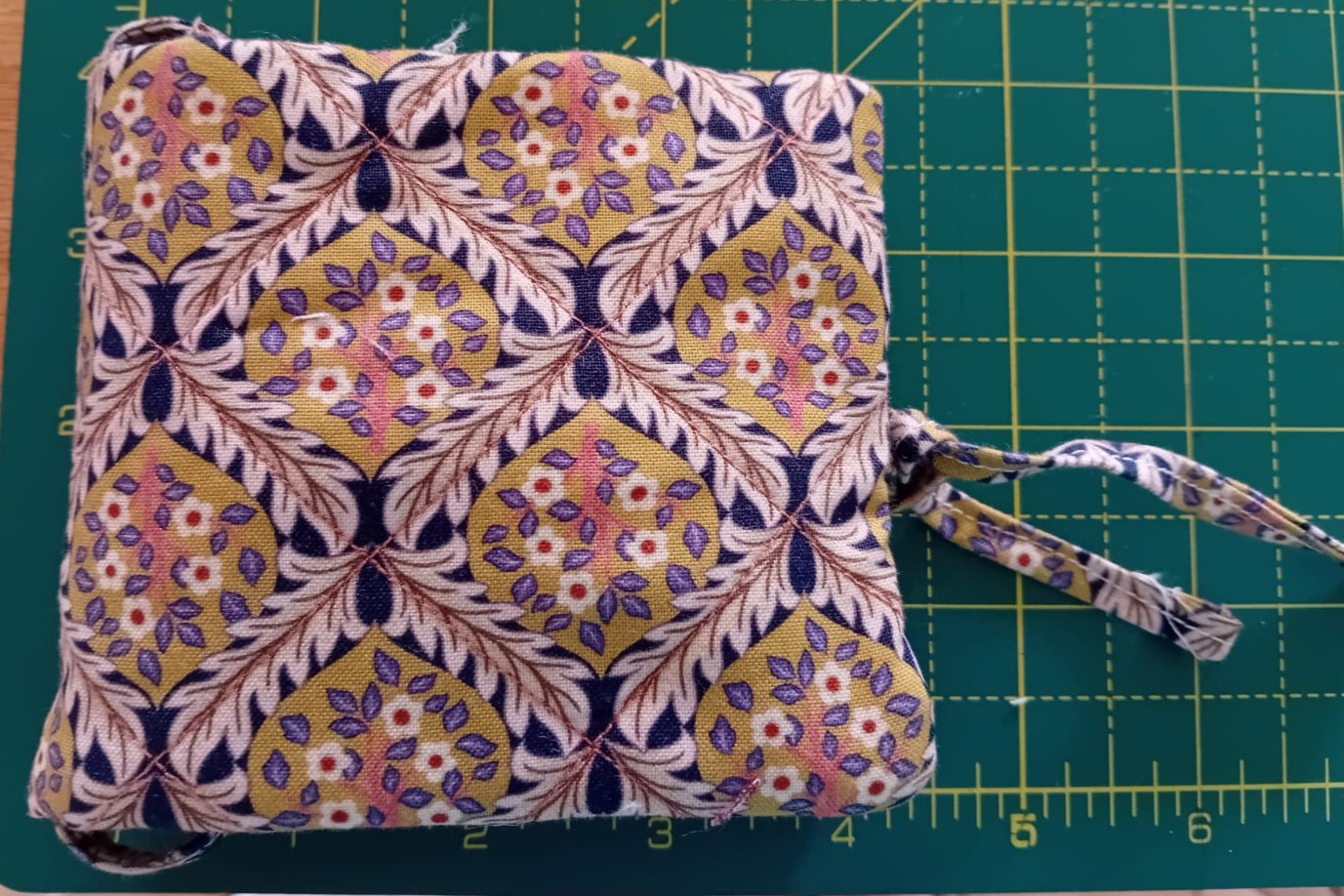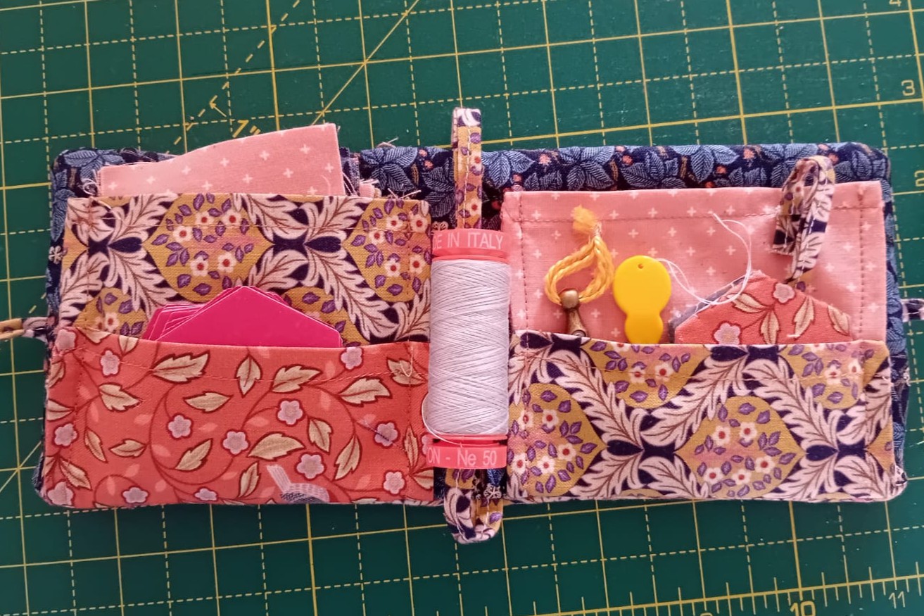 This pouch is only 4 inches square when closed so will easily fit into a pocket or handbag. It has storage space for 2 1/2 inch fabric squares and hexi-card templates, and a spare pocket for joined hexis.